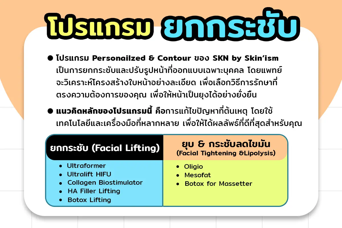 โปรแกรม Personalized Facial Lift & Contour ของ SKN Clinic by Skin’ism เป็นการยกกระชับและปรับรูปหน้าที่ออกแบบเฉพาะบุคคล โดยแพทย์จะวิเคราะห์โครงสร้างใบหน้าอย่างละเอียด เพื่อเลือกวิธีการรักษาที่ตรงกับปัญหาและความต้องการของคุณ เพื่อให้หน้าเป็นยุงได้อย่างยั่งยืน